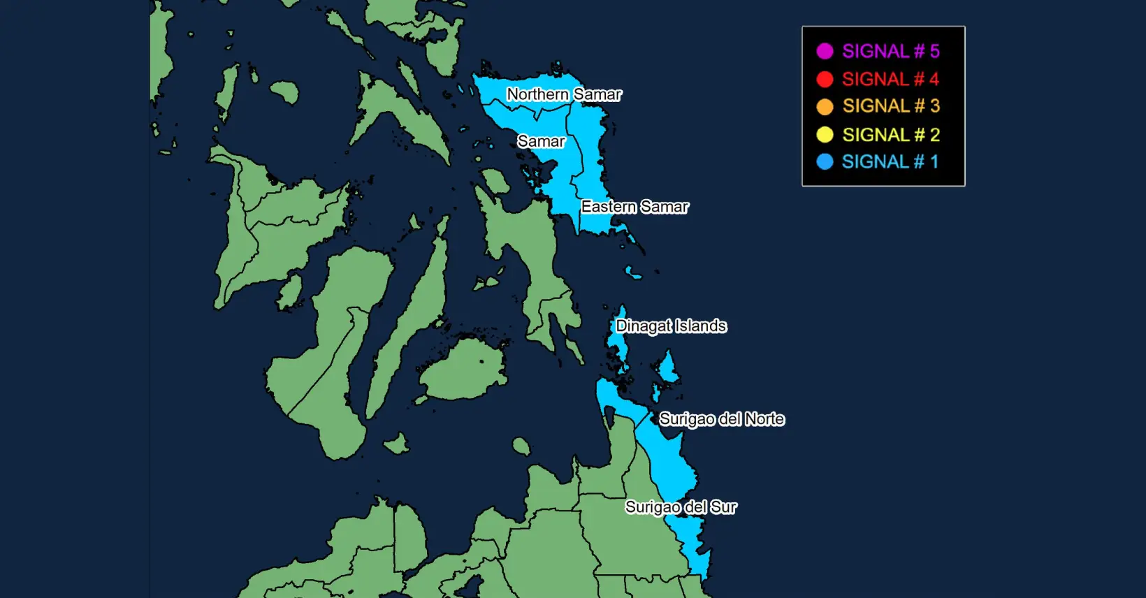 Tungod niini, gipataas ang tropical cyclone wind signal (TCWS) No. 1 sa musunod nga mga dapit: Sa Visayas: Northern Samar, Samar, ug Eastern Samar. Sa Mindanao: Dinagat Islands, Surigao del Norte ug Surigao del Sur.