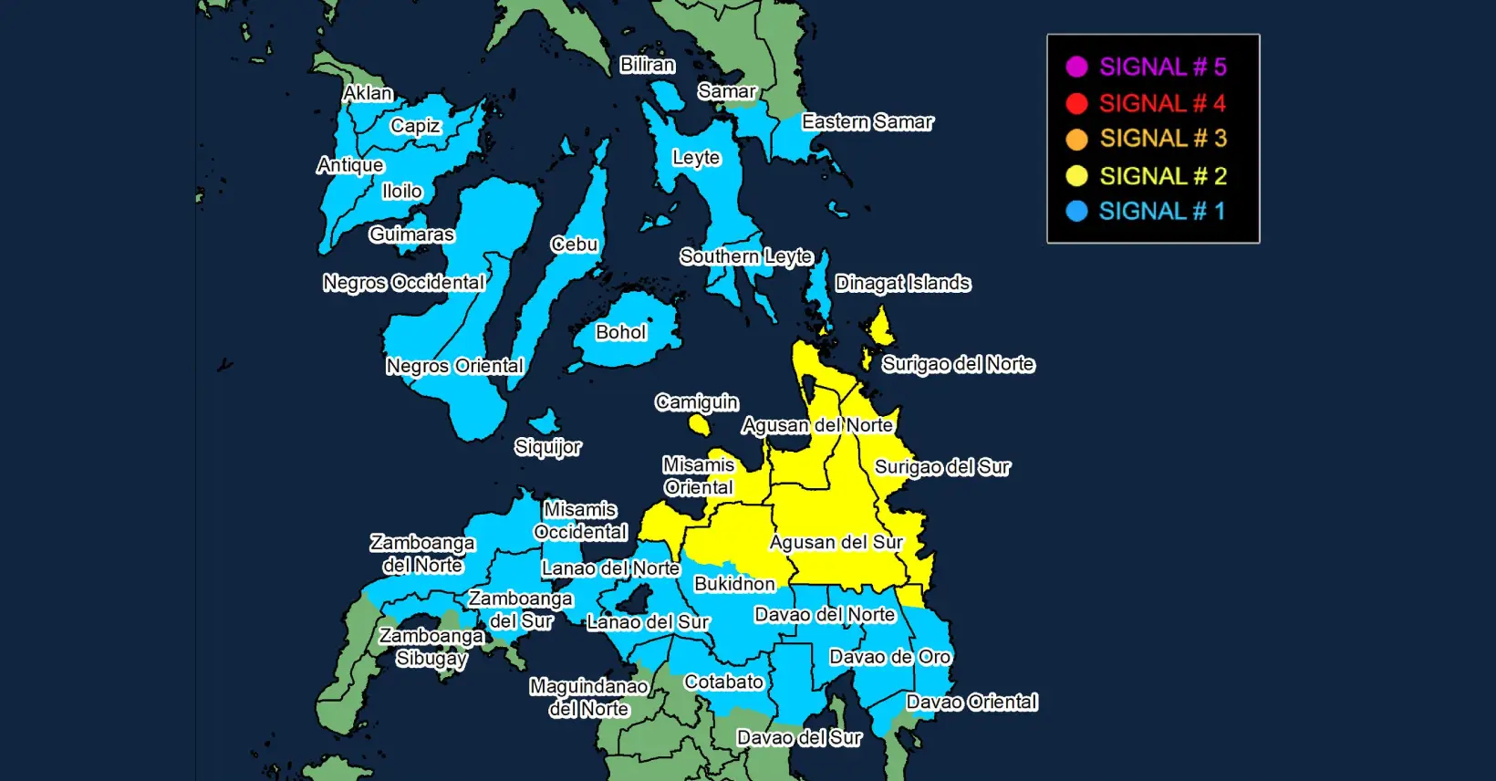 Sa pinakaulahing taho, ang sentro sa bagyo gibanabanang anaa sa 440 kilometro silangan sa Hinatuan, Surigao del Sur.