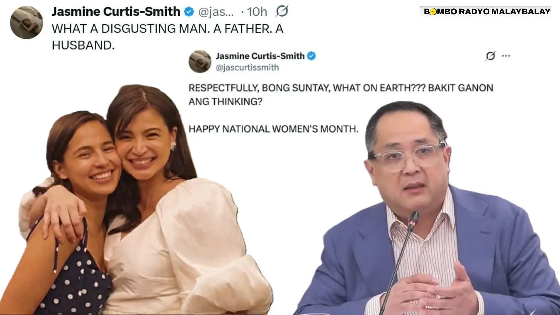 Gitawag sa aktres nga Jasmine Curtis‑Smith si Quezon City 4th District Rep. Jesus “Bong” Suntay nga “disgusting man” human sa kontrobersyal niini nga pamahayag kabahin sa igsoon niini nga si Anne Curtis.