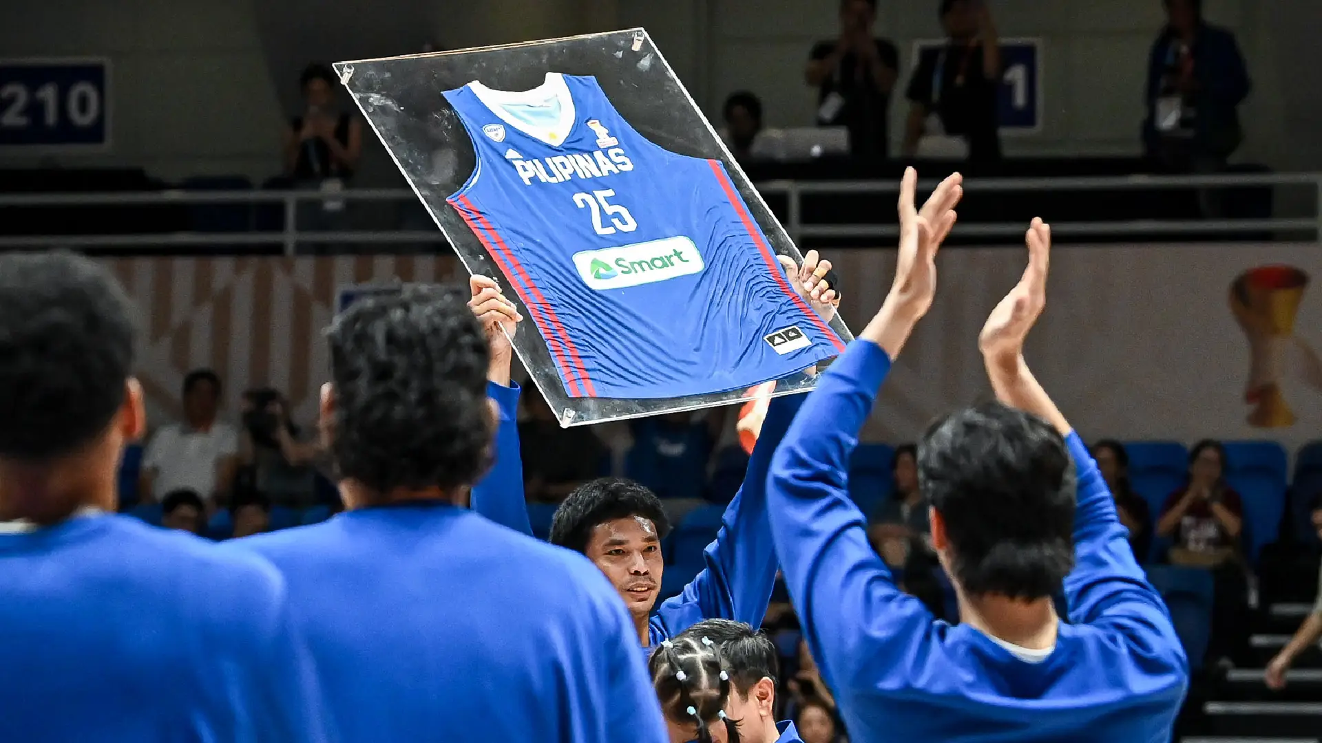 Human sa kadaugan batok sa Guam alang sa first window sa FIBA World Cup Asian Qualifiers, gipresentar sa mga opisyal sa Samahang Basketbol ng Pilipinas kang Aguilar ang framed uniform niini.